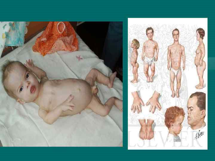 • Синдром гипотиреоза – клинический синдром, вызванный длительным, стойким недостатком гормонов щитовидной железы в организме или снижением их биологического эффекта на тканевом уровне. Врожденный гипотиреоз наблюдается с частотой 1 случай на 4000 -5000 родов. • Клиника: Взрослые обычно жалуются на слабость, повышенную утомляемость, плохую переносимость холода, увеличение массы тела при низком аппетите, выпадение волос, снижение памяти, миалгии, артралгии. При осмотре кожа отечная, бледная, сухая, холодная на ощупь. Она может быть желтоватой с оранжевым оттенком в результате отложения каротина. Лицо одутловатое, мимика скудная, глазные щели сужены за счет отека век. Заметно шелушение кожи, выпадение волос. В результате отека голосовых связок голос становится более хриплым. Нередко наблюдается склонность к инфекциям верхних дыхательных путей. •