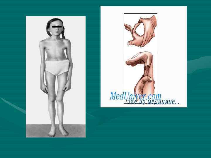 • Синдром Марфана системное поражение соединительной ткани, проявляющееся «патологическими изменениями опорнодвигательного аппарата, глаз и сердечно-сосудистой системы. Впервые синдром описал Марфан в 1896 г. Встречается редко. • Заболевание наследуется по А-Д типу. Установлено, что при С. М. основной дефект связан с нарушениями коллагена, хотя не исключена возможность поражения эластических волокон соединительной ткани. Клиника: у больных резко выражен астенический тип сложения (высокий рост, истончение подкожной клетчатки, мышечная слабость), удлинение пальцев кистей и стоп, долихоцефалия — изменение формы головы, когда продольный размер значительно превышает поперечный, так называемое птичье лицо — узкое, с близкорасположенными глазами, тонким носом и выступающей вперед верхней челюстью (прогнатия); деформация ушных раковин, высокое небо. Иногда наблюдается расщепление твердого неба (волчья пасть). Конечности, пальцы кистей и стоп удлинены, грудная клетка воронкообразной или килевидной формы, ребра тонкие и длинные, межреберные промежутки широкие, позвоночник искривлен.