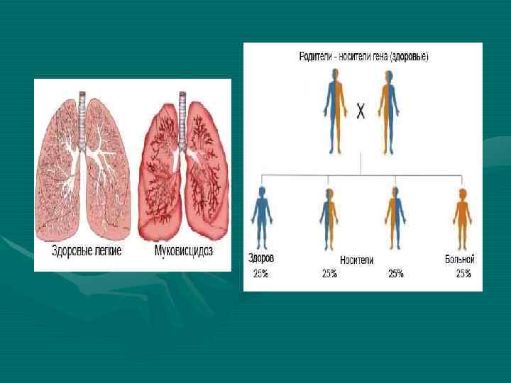• Муковисцидоз — генетическое заболевание, обусловленное мутацией • • гена трансмембранного регулятора муковисцидоза. Проявления муковисцидоза связаны с дефектом синтеза белка, выполняющего роль хлоридного канала, участвующего в водноэлектролитном обмене клеток дыхательных путей, желудочнокишечного тракта, поджелудочной железы, печени, половой системы. В итоге сгущается секрет большинства желез внешней секреции, затрудняется его выделение, в органах возникают изменения, наиболее серьезные — в бронхолегочной системе. В условиях постоянной закупорки вязкой мокротой бронхоэктазы становятся распространенными, нарастает гипоксия, развивается легочная гипертензия и так называемое «легочное сердце» . У больных школьного возраста первыми проявлениями могут быть «кишечные колики» , которые вызывают вздутие живота, повторные рвоты, запоры. Уже в периоде новорожденности и грудном возрасте возникает кашель, приступы удушья, одышка, иногда рвота. Периодически возникает мучительный сильный кашель, особенно по ночам. Мокрота вязкая, иногда гнойная. Так как поражаются все органы, содержащие слизеобразующие железы, типичны колитический синдром, хронический холецистит, синуситы.
