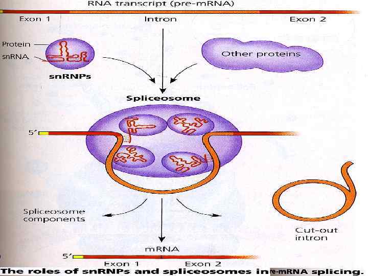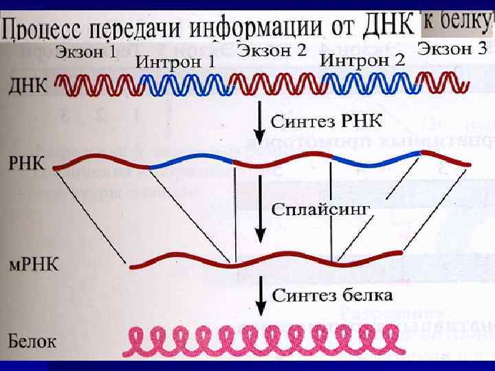 сплайсинг включает: • вырезание из молекулы незрелой м. РНК участков, соответствующих интронам. • сшивание между собой последовательностей