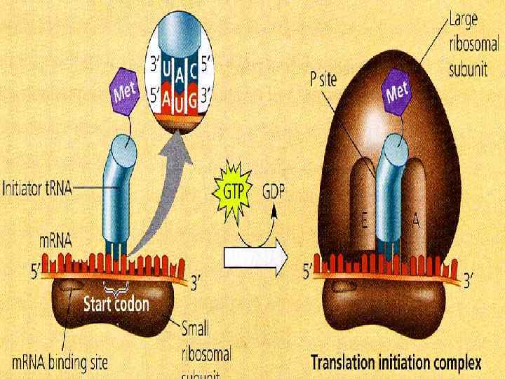 Инициация – образование стартового комплекса трансляции. • Малая субъединица рибосомы соединяется с лидерной областью м. РНК, которая находится на 5’ конце молекулы и предшествует стартовому кодону. • К стартовуму кодону (АУГ) м. РНК присоединяется своим антикодоном метиониновая т. РНК. • Затем присоединяется большая субъединица рибосомы.