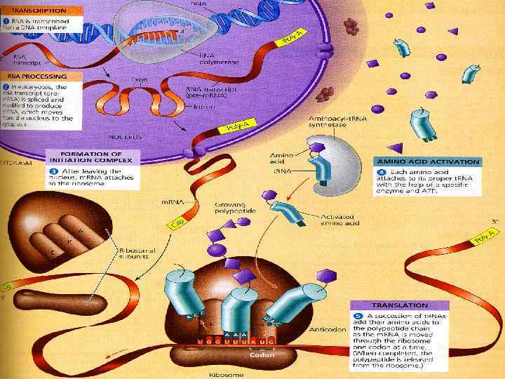 Экспрессия гена 1. Транскрипция ДНК 2. РНК-процессинг. 3. РНК- сплайсинг. 4. Трансляция РНК. 5. Фолдинг протеинов. 6. Пост-трансляционные модификации. 7. Белки управляют метаболизмом клеток, обеспечивая их дифференцировку и развитие признаков.