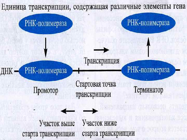 Транскрипция - синтез первичного РНК транскрипта на матрице одной из цепей ДНК. Единица транскрипции или транскриптон включает : • промотор, • точку старта • транскрибируемая часть гена • терминатор • регуляторные последовательности лежащие выше и ниже точки старта. Транскриптон может содержать информацию: • об одном отдельном полипептиде (моноцистронная РНК) • о нескольких полипептидах (полицистронная м. РНК)