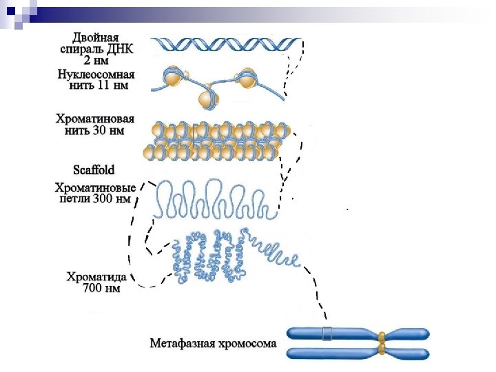 III уровень компактизации Взаимодействие между 30 нм фибриллами и ядерным матриксом (негистоновые белки - ламины, Sc. II, ядерная мембрана, поровые комплексы, внутриядерная сеть) или белковым каркасом хромосом (scaffold) § хроматиновые (радиальные) петли (25 000 -200 000 п. н. ) Районы прикрепления к матриксу или к scfffold