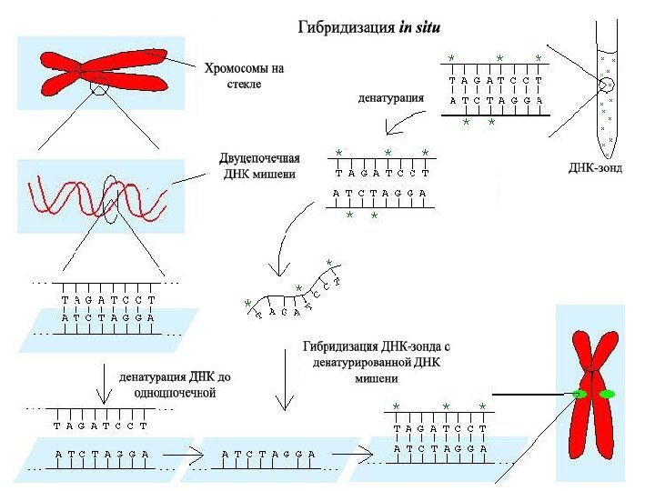 Флуоресцентная гибридизация in situ Fluorescent In Situ Hybridisation FISH - цитогенетический метод, который применяют для детекции и определения положения специфической последовательности ДНК на метафазных хромосомах или в интерфазных ядрах in situ