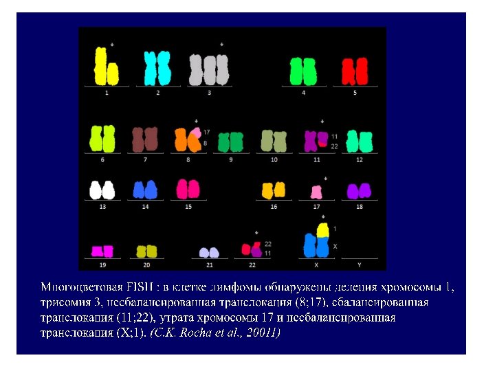 Многоцветный FISH на 24 хромосомы (М-FISH) • Для скрининга перестроек в кариотипе применяют набор полнохромосомных комбинированных зондов для всех хромосом 24 -х цветный FISH (M-FISH, SKY).