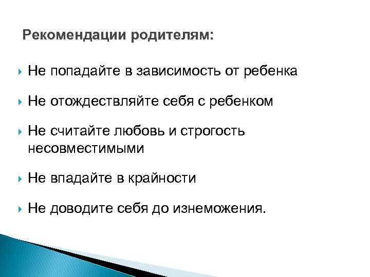 Рекомендации родителям: Не попадайте в зависимость от ребенка Не отождествляйте себя с ребенком Не считайте любовь и строгость несовместимыми Не впадайте в крайности Не доводите себя до изнеможения.