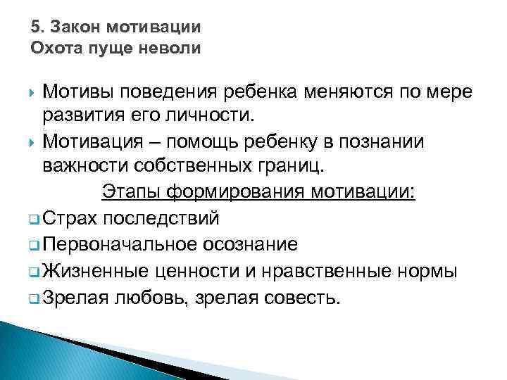5. Закон мотивации Охота пуще неволи Мотивы поведения ребенка меняются по мере развития его личности. Мотивация – помощь ребенку в познании важности собственных границ. Этапы формирования мотивации: q Страх последствий q Первоначальное осознание q Жизненные ценности и нравственные нормы q Зрелая любовь, зрелая совесть.