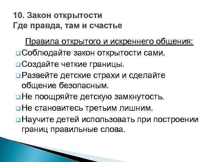 10. Закон открытости Где правда, там и счастье Правила открытого и искреннего общения: q Соблюдайте закон открытости сами. q Создайте четкие границы. q Развейте детские страхи и сделайте общение безопасным. q Не поощряйте детскую замкнутость. q Не становитесь третьим лишним. q Научите детей использовать при построении границ правильные слова.