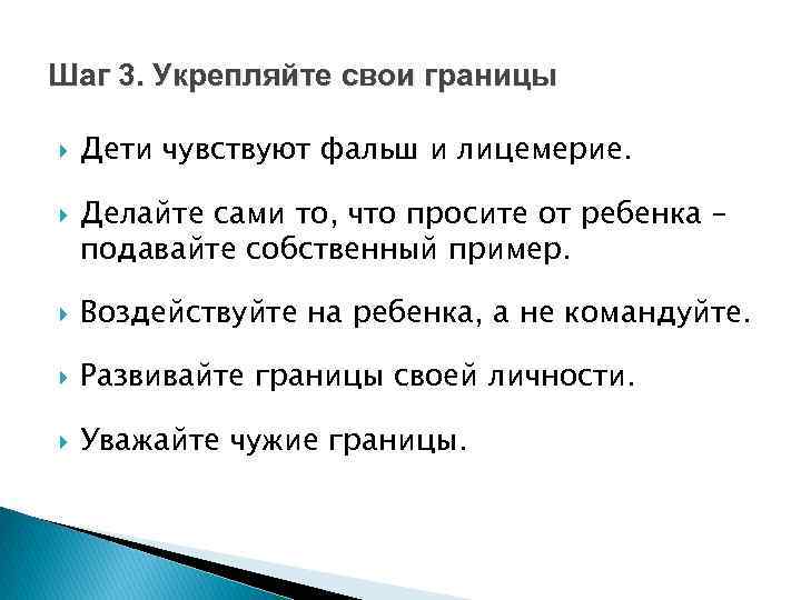 Шаг 3. Укрепляйте свои границы Дети чувствуют фальш и лицемерие. Делайте сами то, что просите от ребенка – подавайте собственный пример. Воздействуйте на ребенка, а не командуйте. Развивайте границы своей личности. Уважайте чужие границы.