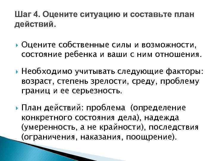 Шаг 4. Оцените ситуацию и составьте план действий. Оцените собственные силы и возможности, состояние ребенка и ваши с ним отношения. Необходимо учитывать следующие факторы: возраст, степень зрелости, среду, проблему границ и ее серьезность. План действий: проблема (определение конкретного состояния дела), надежда (умеренность, а не крайности), последствия (ограничения, наказания, поощрение).