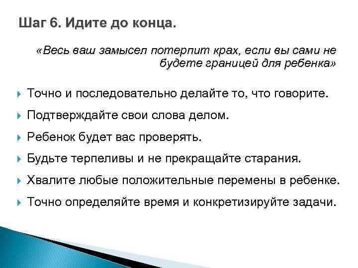 Шаг 6. Идите до конца. «Весь ваш замысел потерпит крах, если вы сами не будете границей для ребенка» Точно и последовательно делайте то, что говорите. Подтверждайте свои слова делом. Ребенок будет вас проверять. Будьте терпеливы и не прекращайте старания. Хвалите любые положительные перемены в ребенке. Точно определяйте время и конкретизируйте задачи.