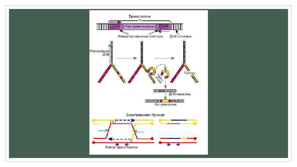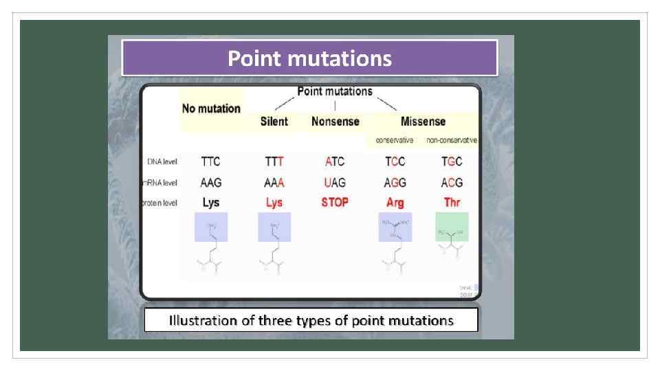Виды мутаций Изменения в структуре ДНК Изменения в структуре белка ЗАМЕНА Без изменения смысла кодона Замена одного нуклеотида в кодоне Белок не изменён С изменением смысла кодона (миссенс-мутация) Происходит замена одной аминокислоты на другую С образованием терминирующего кодона (нонсенс-мутация) Синтез пептидной цепи прерывается, и образуется укороченный продукт ВСТАВКА Без сдвига «рамки считывания» Вставка фрагмента ДНК из 3 нуклеотидов или Происходит удлинение полипептидной цепи с числом нуклеотидов, кратным 3 на одну или несколько аминокислот Со сдвигом «рамки считывания» Вставка одного или нескольких нуклеотидов, не кратных 3 Синтезируется пептид со «случайной» последовательностью аминокислот, так как изменяется смысл всех кодонов, следующих за местом мутации ДЕЛЕЦИЯ Без сдвига «рамки считывания» Выпадение фрагмента ДНК из 3 нуклеотидов Происходит укорочение белка на одну или с числом нуклеотидов, кратным 3 несколько аминокислбт Со сдвигом «рамки считывания» Выпадение одного или нескольких нуклеотидов, не кратных 3 Синтезируется пептид со «случайной» последовательностью аминокислот, так как изменяется смысл всех кодонов, следующих за местом мутации