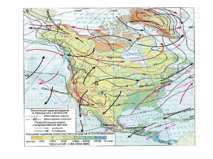 1. Аляскинское (теплое)течение. 2. Калифорнийское (холодное)течение. 3. Кордильеры. 4. Западная Сьерра-Мадре. 5. Восточная Сьерра-Мадре. 6. Аппалачи. 7. Гольфстрим. 8. Лабрадорское (холодное)течение. 9. Теплое стоковое течение.