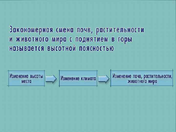 Закономерность расположения природных зон. Запишите их в тетрадь. Чем выше горы, тем больше набор природных зон (многоэтажность). Чем ближе к экватору, тем разнообразнее природные комплексы в горах. Смена природных зон в горах схожа со сменой природных зон на равнине, с юга на север. Смена природных зон на северных и южных склонах отличаются. Снега на северных склонах начинаются на меньшей высоте. Первая природная зона у подножья та, в которой находятся горы.