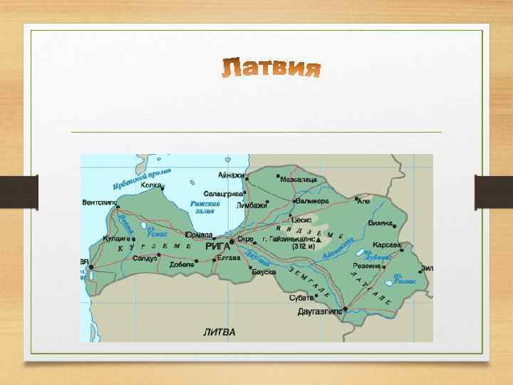 География Латвийская республика Находится на северовостоке Европы. На севере граничит с Эстонией, на востоке – с Россией, на юге – с Беларусью и Литвой. На западе омывается Балтийским морем.