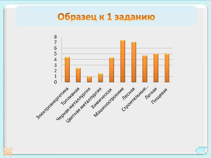Задание 1. По данным таблицы построить столбчатую диаграмму «Отраслевая структура промышленности Северо. Западного района» Отрасль промышленности Доля в промышленной продукции, % Электроэнергетика Топливная Черная металлургия Цветная металлургия Химическая промышленность Машиностроение Лесная промышленность Промышленность строительных материалов Легкая промышленность Пищевая промышленность 4, 4 2, 5 1, 0 1, 5 4, 3 7, 4 7, 1 4, 7 4, 9 5, 0 2 3 4 5 Образец