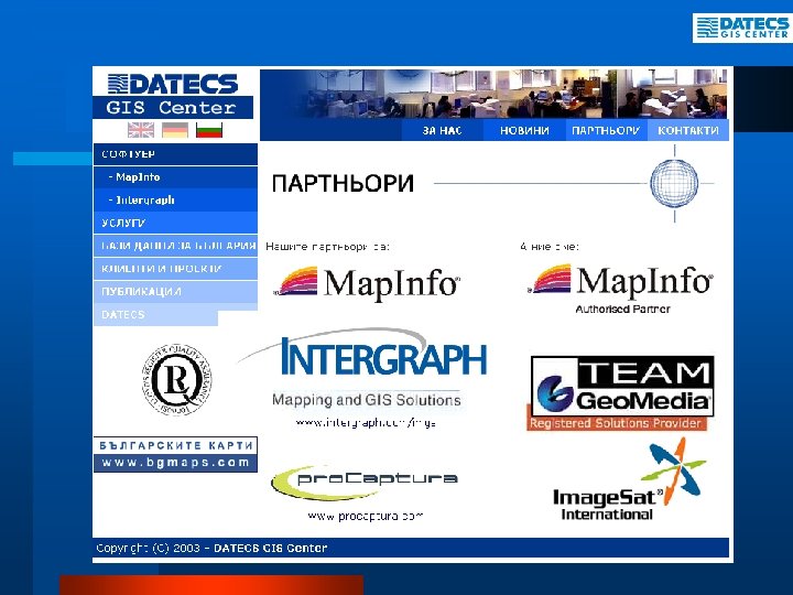 КЛИЕНТИ И ПРОЕКТИ GEOSYS S. A. , France завърши голям кадастрален проект във Франция за сканиране, обработка и дигитализация на повече от 100, 000 ортофото изображения и създаването на БД с регистри на имотите. URBICA S. A. , France – В и Кадастър подизпълнител за подземен (В и К) и надземен кадастър. Въвеждане на точната геометрия на съоръженията и детайлна паспортна информация за тях. Преобразуване на данни и създаване на софтуер за генериране на мрежова топология и отчети. BERTELSMANN AG, Germany цифрова картография. Euro-Cities AG, Germany цифрова картография и разработка на Internet услуги.