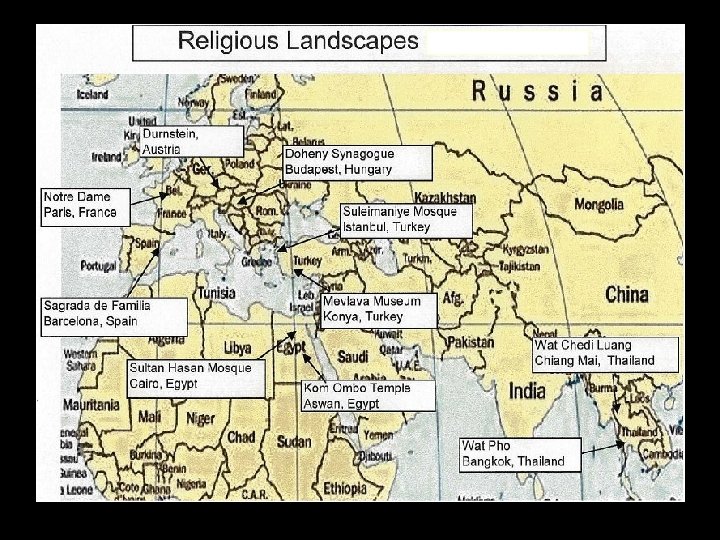 Religious Landscapes • Sacred Structures – Temples / Pagodas – Churches / Basilicas – Mosques • Sacred Sites – mountains – rivers – caves