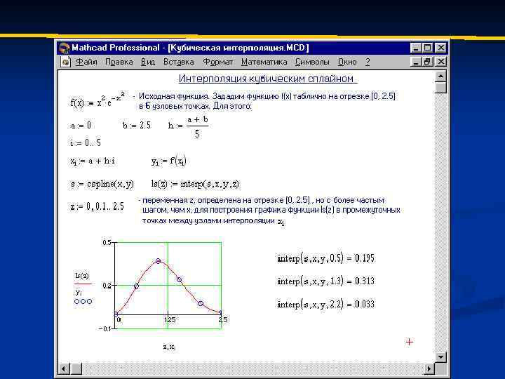 Кубическая сплайн-интерполяция позволяет провести кривую через набор точек таким образом, что первые и вторые производные кривой непрерывны в каждой точке. Эта кривая образуется путем создания ряда кубических полиномов, проходящих через наборы из трех смежных точек. Кубические полиномы затем состыковываются друг с другом, чтобы образовать одну кривую. Math. CAD поставляется с тремя сплайн-функциями: cspline pspline lspline Они возвращают вектор коэффициентов вторых производных, который мы будем называть. VS. Этот вектор обычно используется в функции interp, описанной ниже. Аргументы VX и VY должны быть вещественными векторами одинаковой длины. Значения вектора должны быть расположены в порядке возрастания. Эти три функции отличаются только граничными условиями: 1. функция lspline генерирует кривую сплайна, которая приближается к прямой линии в граничных точках; 2. функция pspline генерирует кривую сплайна, которая приближается к параболе в граничных точках. 3. функция cspline генерирует кривую сплайна, которая может быть кубическим полиномом в граничных точках.
