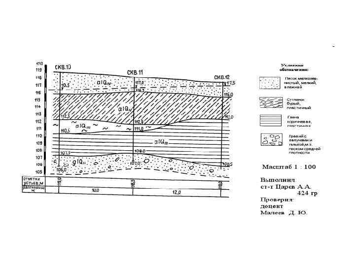 3. Строится геологический разрез. На осях скважин, отмеченных тонкими линиями, наносятся абсолютные отметки устьев скважин. Полученные три точки соединяются от руки. При этом линия проводится за крайние скважины на 1 – 2 см. Так будет обозначена дневная поверхность. Затем на осях скважин откладываются отметки подошвы первого от поверхности геологического слоя. Полученные точки также соединятся от руки и линия подошвы проводится за крайние скважины на 1 – 2 см. В геологического слое на разрезе отмечают генезис и возраст породы, наносят цифры отметок подошв слоя у каждой скважины, и условную штриховку породы, слагающей слой. Отметки уровней и напоров в соседних скважинах соединяют. Аналогично ведется построение второго, третьего и остальных геологических слоев на разрезе. Если в одной скважине присутствует данная порода, а в соседней отсутствует, это означает, что в интервале между скважинами она выклинивается. Скважины отмечаются жирными линиями. Забои (конечные части) скважин отмечаются короткими площадками, перпендикулярными осям скважин.