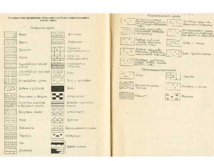 Буквенные и цифровые (индексы) указывают возраст и происхождение пород. Для обозначения осадочных, вулканических и метаморфических пород индекс составляется из прописных и строчных букв латинского алфавита и цифр. Первой ставится прописная латинская буква, обозначает систему, внизу справа от нее арабской цифрой отдел, далее ярус строчными латинскими буквами, затем цифры справа внизу √ подъярус. Пример: К 1 al 3. При необходимости буквенными знаками обозначают комплексы, серии, свиты, горизонты. Буквами греческого алфавита обозначают также состав интрузивных и некоторых вулканических пород (пример: кислые g, средние d, щелочные x, основные n, ультраосновные s). Внемасштабные (линейные) маркирующие горизонты (слои, пласты), дайки, жилы, геологические границы, разрывные нарушения, геологоразведовательные выработки (скважины). Условные знаки помещаются в прямоугольнике; справа словесные описания. Знаки в легенде располагаются сверху вниз от молодых к древним. Знаки магматических пород (от кислых к у/о) ниже. В самом низу внемасштабные.