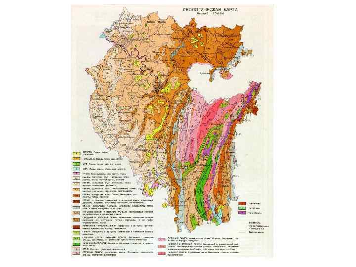 • Собственно геологические карты являются по содержанию стратиграфическими картами дочетвертичных пород. Четвертичные отложения на них не показываются, за исключением случаев, когда мощность их велика или неизвестны подстилающие породы. Условные знаки показывают возраст, состав, происхождение, условия залегания горных пород и характер границ между ними. • Карты четвертичных отложений - показывают их с разделением по генезису, возрасту и составу. • Литологические карты помимо возраста показывают в условных обозначениях (краном штрихом, точками и т. д. ) состав пород. • Геоморфологические карты показывают основные типы рельефа и его отдельные элементы с учетом их происхождения и возраста.