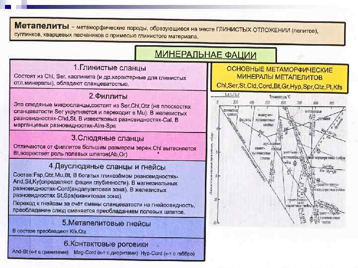 Термины метаморфизм и диагенез Формирование осадочных пород связано с воздействием на осадки экзогенных факторов – температуры и давления, возрастающих при их погружении в ходе накопления слоистых толщ. Этот процесс формирования осадочных толщ называется диагенезом. Метаморфические горные породы в свою очередь образуются на месте осадочных и магматических при воздействии на них глубинных флюидов, Т и Р путем перекристаллизации в твердом состоянии. n В отличие от метаморфизма диагенез не связан с тектоническими дислокациями и внедрениями изверженных пород, сопровождаемыми подъемом ювенильных флюидов и термическими аномалиями. Его область располагается вдоль линии геотермического градиента, тогда как метаморфизм отвечает либо более высоким температурам при одинаковой глубинности, или более низкому давлению при соответствии по температуре. Так как диагенез и метаморфизм имеют существенную область перекрытия по температуре, существует сходство глубоко преобразованных осадков и слабометаморфизованных пород по парагенезисам минералов (серицит-хлорит, альбит-хлорит, мусковит-хлорит) n