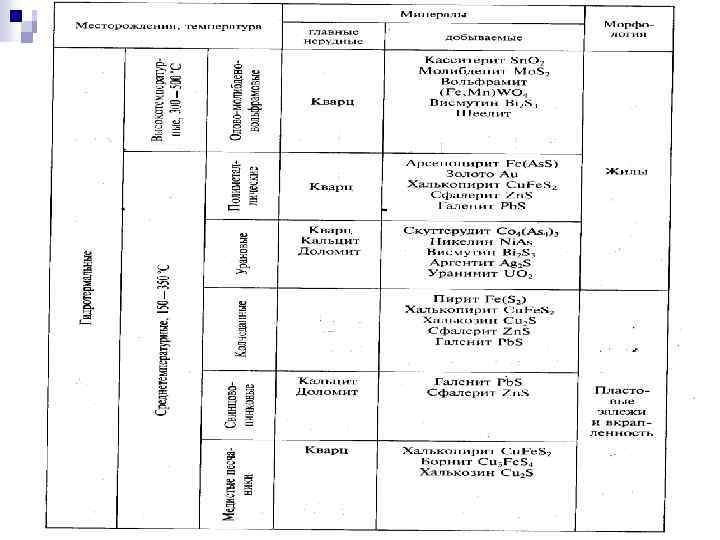 Классификация гидротермальных месторождений n В зависимости от температур образования принято выделять пневматолитовые (выше 400°С) и собственно гидротермальные месторождения (400 - 50°С). Несколько особняком стоят гидротермальные жилы т. наз. "альпийского типа", минералообразование в которых происходит вне зависимости от близости магматических очагов и их влияния.
