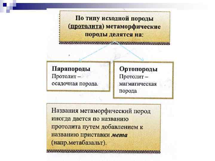 Критерии выделения протолита n n n Минералогические. Например, если есть ставролит, хлоритоид, And, Ky, Sill - это глинистые осадочные породы. Также для метапелитов (производных глинистых осадочных) характерны серицит, мусковит, кордиерит, сапфирин, встречается ПШ. Показателем может служить количество минералов в породе (если 50 -60% слюд – глинистокарбонатные породы). Для ортопород характерным признаком может служить магматический плагиоклаз (с четкими полисинтетическими двойниками, зональностью) Петрографические. Если в породе сохраняются реликтовые текстуры и структуры. Миндалины, (Ep, Q) – скорее всего, базальт; полосчатость – осадочная. Pl/Chl+Ep+Act – переслаивание глинистокремнистых и глинистых полос. Петрохимические. У метапелитов Ca. O< 5%, Si. O 2 45 -75%, Al 2 O 3 1326%, сумма щелочей до 7% (калия сильно больше чем натрия). У метабазитов Ca. O 6 -13%, Si. O 2 42 -56%, Al 2 O 3 10 -20%, сумма щелочей 1 -5% (калия меньше). Геологические. К примеру, условия залегания. Если рвущий контакт – орто-, если согласный – скорее всего, парапорода. Если согласно залегают кварциты – кварцито-сланцы – слюдяные сланцы – амфиболиты – мраморы, то исходные породы, соответственно: кварцевые песчаники – кварцевые песчаники с глинистым цементом – глины – мергели – карбонаты.