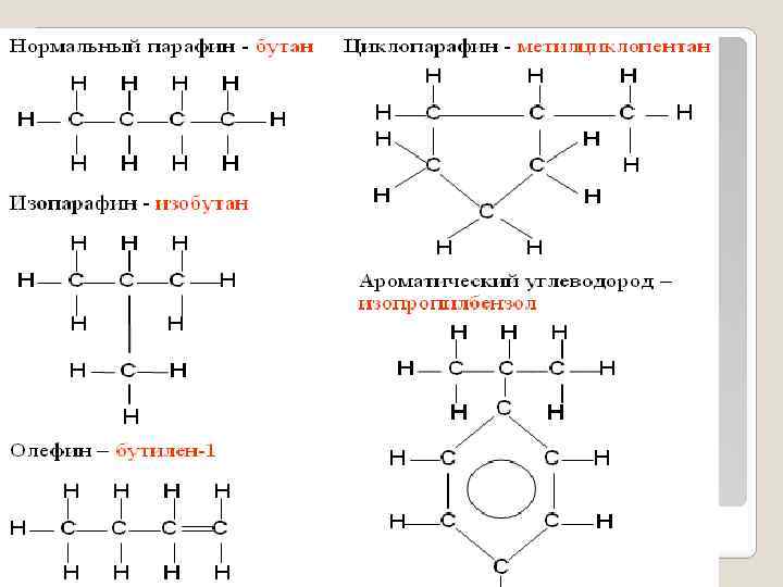 Углеводороды Гомологическ Число атомов Число идент. ий ряд углерода в индив. молекуле углеводородов Нафтеновые Моноциклические Cn. H 2 n 5 -7 10 Cn. H 2 n 8 -9 53 Cn. H 2 n 10 -12 23 Бициклические Cn. H 2 n-2 8 5 Cn. H 2 n-2 9 -12 20 Трициклические Cn. H 2 n-4 10 -13 Тетра- и пента- Cn. H 2 n-6 5 циклические Cn. H 2 n-4 14 -30 4