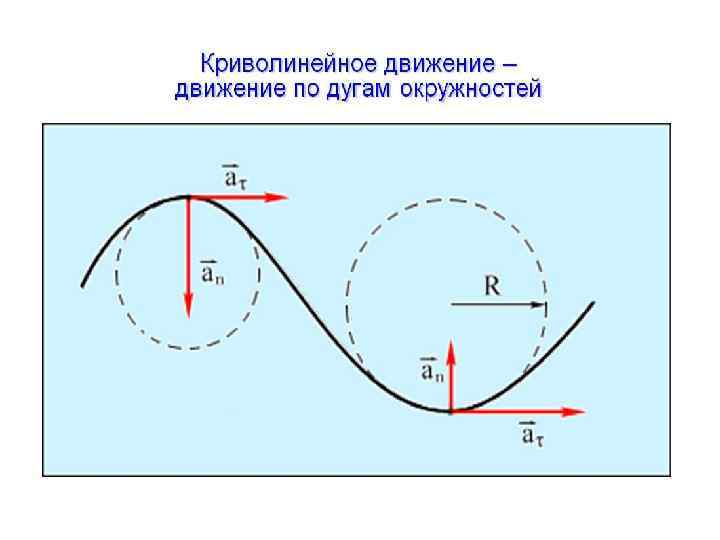 • Криволинейное движение— движение точки по траектории, не представляющей собою прямую, с произвольным ускорением и произвольной скоростью в любой момент времени (например, движение по окружности).