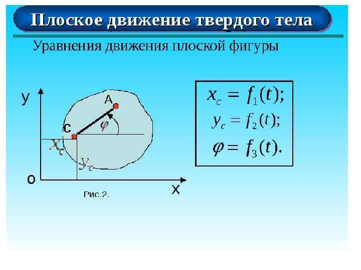 • Движение твёрдого тела складывается из движения какойлибо его точки (например, центра масс) и вращательного движения вокруг этой точки. Изучается кинематикой твёрдого тела. Если вращение отсутствует, то движение называется поступательным и полностью определяется движением выбранной точки. Движение при этом не обязательно является прямолинейным. • Для описания вращательного движения— движения тела относительно выбранной точки, например закреплённого в точке, — используют Углы Эйлера. Их количество в случае трёхмерного пространства равно трём. • Также для твёрдого тела выделяют плоское движение— движение, при котором траектории всех точек лежат в параллельных плоскостях, при этом оно полностью определяется одним из сечений тела, а сечение тела— положением любых двух точек.