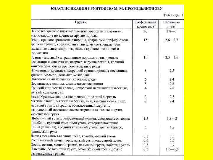 Общие сведения о классификации горных пород Общая геомеханическая классификация горных пород (на классы) I. III. IV. Твердые, в которых минеральные частицы жестко связаны между собой, обычно с помощью цементирующего вещества, что обеспечивает сохранение формы. Граниты, базальты, песчаники, известняки, аргиллиты, алевролиты. Связные или пластичные, в которых минеральные частицы связаны водноколлоидной связью, что изменяет степень их пластичности при насыщении водой. Глины, суглинки, слабые глинистые сланцы. Раздельно-зернистые или сыпучие, в которых связи между минеральными частицами отсутствуют или ничтожно малы. Пески, гравийно-галечные отложения, техногенные отвалы пород. Текучие, в которых минеральные частицы разобщены водой и способны перемещаться с этой водой. Насыщенные водой пески, глины или суглинки. Геомеханическая классификация горных пород по коэффициенту крепости f = R/10 (прочность образца горной породы на одноосное сжатие R в МПа) в первом приближении. Все породы разделены на 10 категорий. I и II категории - породы высшей крепости с f >15. Кварциты, базальты. III и IV категории – крепкие породы с f = 8 -15. Граниты, песчаники. V категория – породы средней крепости с f =3 -8. Крепкие глинистые сланцы, некрепкие известняки и песчаники, конгломераты. VI и VII категории – мягкие породы с f = 0. 8 -2. Уголь, глины, соли, мягкие сланцы. VIII – Х категории – землистые, сыпучие и плывучие грунты с f = 0. 3 -0. 6. Торф, лесс.