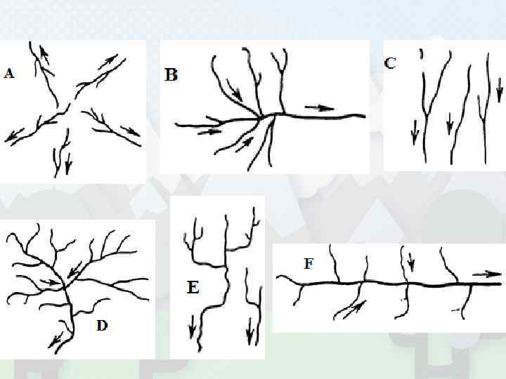 Типы речной сети древовидный параллельный перистый радиальный центробежный радиальный центростремительный решетчатый