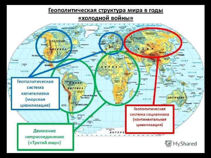 Каждый конкретный регион планеты может быть разложен на четыре геополитические составляющие: внешняя морская (водная) среда, зависящая от торгового флота и портов; континентальное ядро (nucleus), тождественное «Hinterland» (геополитическому термину, означающему «удаленные от побере жья внутренние регионы» ); дисконтинуальный пояс (береговые сектора, ориентирован ные либо внутрь континента, либо от него); регионы, геополитически независимые от этого ансамбля