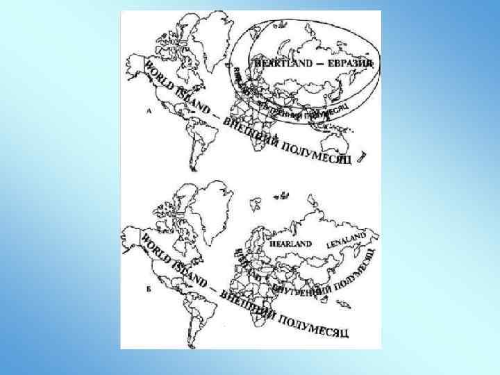 Хелфорд Макиндер (1861 -1947) «Географическая ось истории» Тот, кто контролирует Восточную Европу, доминирует над Heartland’ом; тот, кто доминирует над Heartland’ом, доминирует над миром