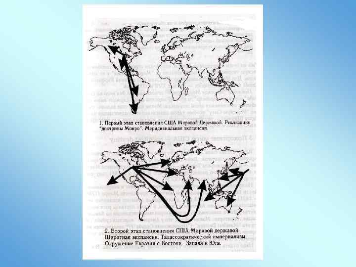 Господство над всеми прилегающими территориями получает тот народ, которому удастся установить политический контроль над всей береговой зоной, прилегающей к одному из трех «мировых морей» . Три системы геополитического контроля над пространством: кольцеобразная, точечная, континентальная Два вида освоения пространства: внедрение завоевание