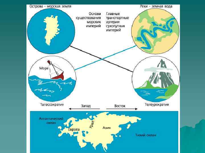 Согласно ЗАКОНУ ФУНДАМЕНТАЛЬНОГО ДУАЛИЗМА, географическое устройство планеты и особенности исторического развития цивилизаций сформировали две разновидности обществ: ТЕЛЛУРОКРАТИЯ ТАЛАССОКРАТИЯ
