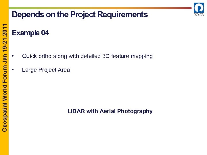 Geospatial World Forum Jan 19 -21, 2011 Depends on the Project Requirements Example 04 • Quick ortho along with detailed 3 D feature mapping • Large Project Area Li. DAR with Aerial Photography