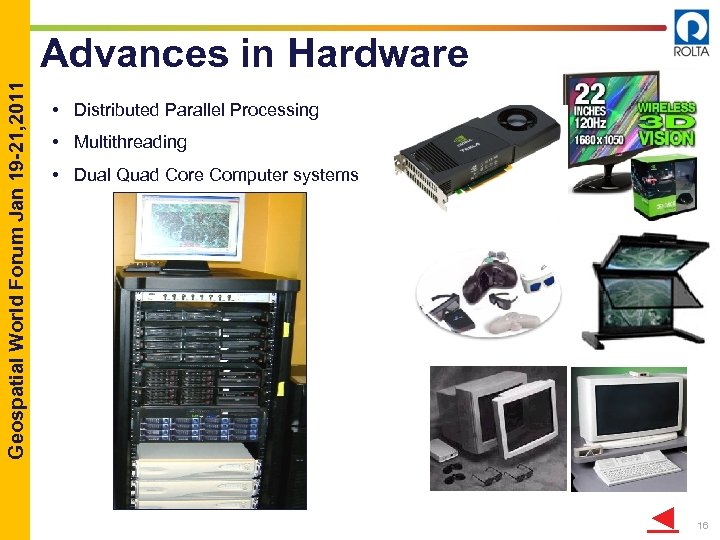 Geospatial World Forum Jan 19 -21, 2011 Advances in Hardware • Distributed Parallel Processing • Multithreading • Dual Quad Core Computer systems ◄ 16
