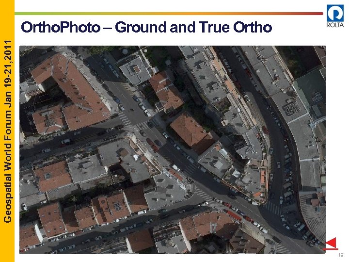 Geospatial World Forum Jan 19 -21, 2011 True Ortho Traditional Orthoimage - Rectified from a DTM (ground floor) - Slanted building - Occluded areas True Orthoimage - Rectified from a DSM - Straight buildings (roofs correctly located) - No occluded areas 18