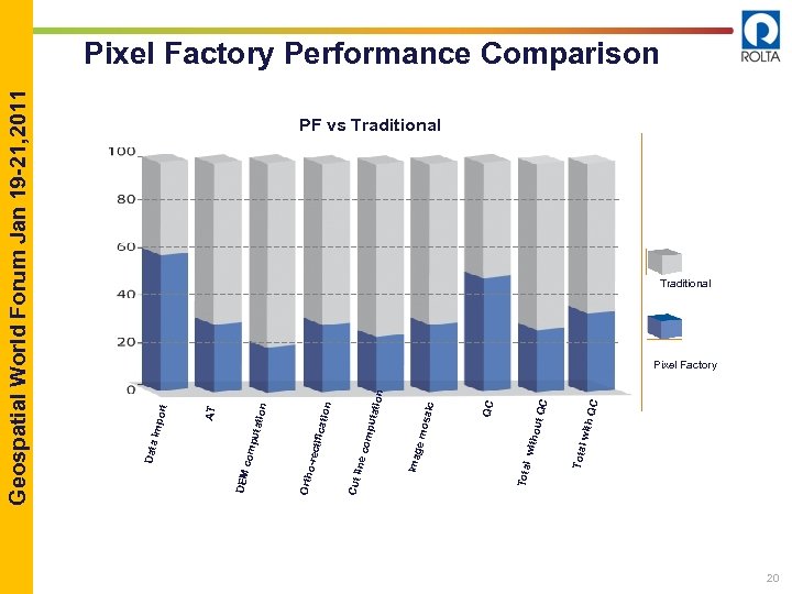 Tota l with C QC with out Q QC saic tion puta com tion ifica Imag e mo line Tota l Cut o-rec t Orth on AT rt Impo utati omp DEM c Data Geospatial World Forum Jan 19 -21, 2011 Pixel Factory Performance Comparison PF vs Traditional Pixel Factory 20