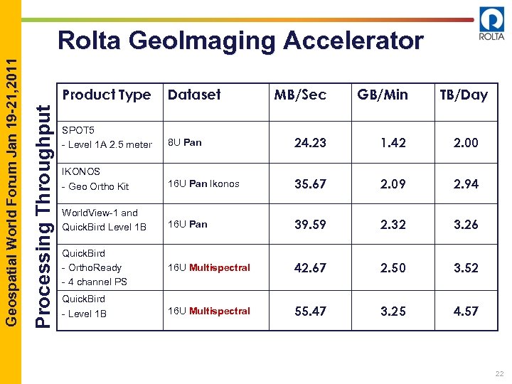 Product Type Processing Throughput Geospatial World Forum Jan 19 -21, 2011 Rolta Geo. Imaging Accelerator Dataset MB/Sec GB/Min SPOT 5 - Level 1 A 2. 5 meter TB/Day 8 U Pan 24. 23 1. 42 2. 00 IKONOS - Geo Ortho Kit 16 U Pan Ikonos 35. 67 2. 09 2. 94 World. View-1 and Quick. Bird Level 1 B 16 U Pan 39. 59 2. 32 3. 26 Quick. Bird - Ortho. Ready - 4 channel PS 16 U Multispectral 42. 67 2. 50 3. 52 Quick. Bird - Level 1 B 16 U Multispectral 55. 47 3. 25 4. 57 22