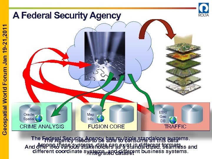 Geospatial World Forum Jan 19 -21, 2011 A Federal Security Agency Oracle Spatial CRIME ANALYSIS Map Info FUSION CORE ESRI Geo DB TRAFFIC The Federal Security Agency has multiple standalone systems. The Agency needs to be able to consume all this data Among these systems, data can exist in different seamless And offer it to various stakeholders as a standardized, formats, and different coordinate systems, and different business systems. integrated dataset