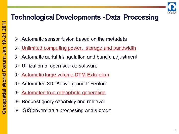 Geospatial World Forum Jan 19 -21, 2011 Technological Developments - Data Acquisition Ø Aerial digital camera systems Ø High resolution stereo satellite data Ø Integration with Li. DAR systems Ø Sophisticated Sensor Models Ø Sensor advancements active/passive sensors Ø Real-time processing through automation Ø Self calibration of data collection instruments Ø New sensors for navigation-based georeferencing and imaging (2 D / 3 D) 4