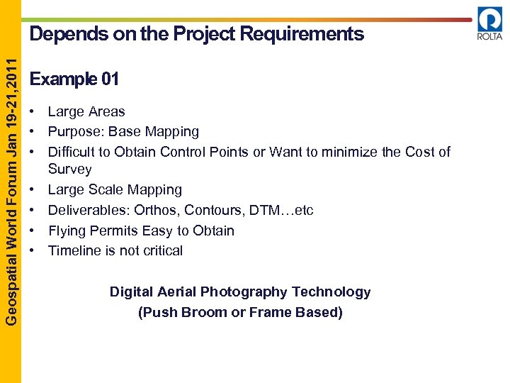 Geospatial World Forum Jan 19 -21, 2011 Depends on the Project Requirements Example 01 • Large Areas • Purpose: Base Mapping • Difficult to Obtain Control Points or Want to minimize the Cost of Survey • Large Scale Mapping • Deliverables: Orthos, Contours, DTM…etc • Flying Permits Easy to Obtain • Timeline is not critical Digital Aerial Photography Technology (Push Broom or Frame Based)