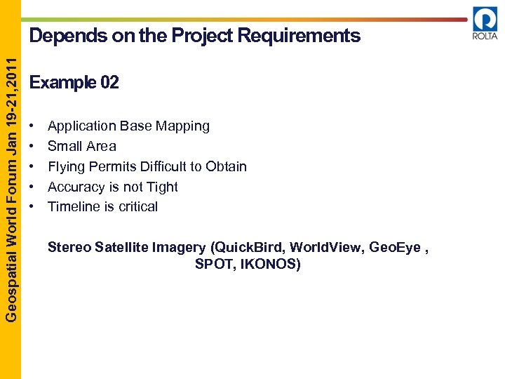 Geospatial World Forum Jan 19 -21, 2011 Depends on the Project Requirements Example 02 • • • Application Base Mapping Small Area Flying Permits Difficult to Obtain Accuracy is not Tight Timeline is critical Stereo Satellite Imagery (Quick. Bird, World. View, Geo. Eye , SPOT, IKONOS)