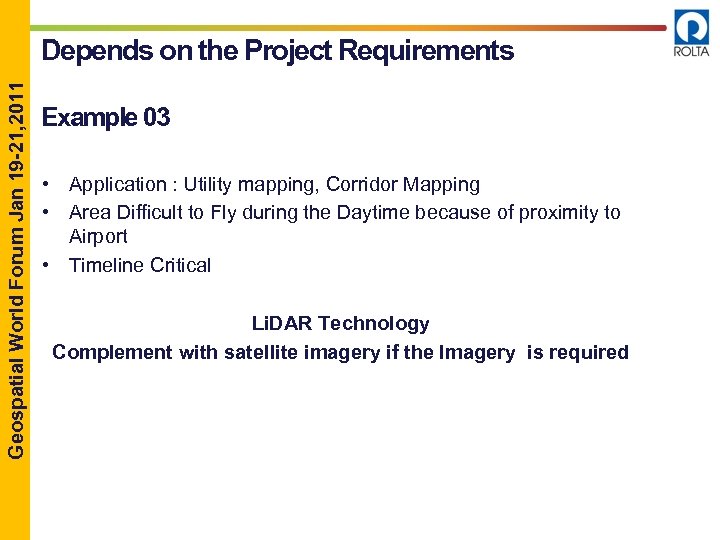 Geospatial World Forum Jan 19 -21, 2011 Depends on the Project Requirements Example 03 • Application : Utility mapping, Corridor Mapping • Area Difficult to Fly during the Daytime because of proximity to Airport • Timeline Critical Li. DAR Technology Complement with satellite imagery if the Imagery is required