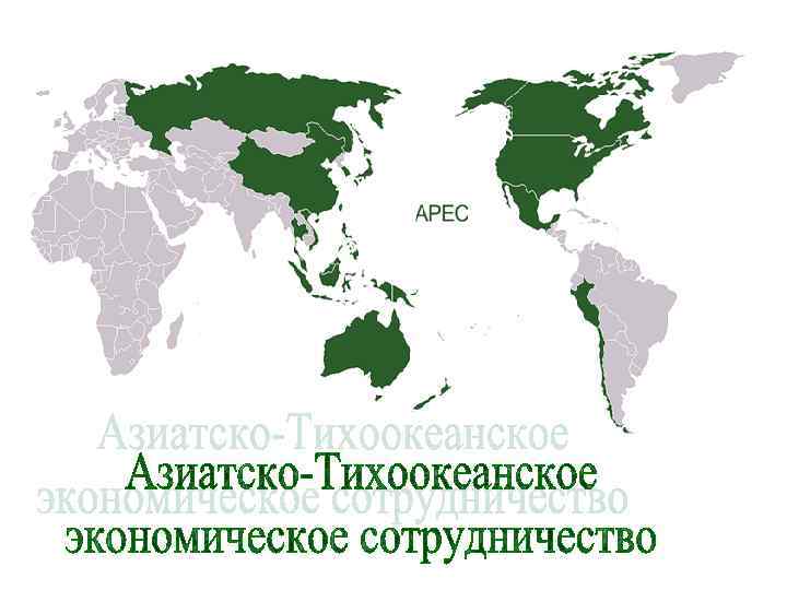 Азиатско-Тихоокеанское экономическое сотрудничество (АТЭС) n n Азиатско-Тихоокеанское экономическое сотрудничество (АТЭС) — форум 21 страны Азиатско-Тихоокеанского региона для сотрудничества в области региональной торговли и облегчения и либерализации капиталовложений. Организация образована в 1989 году в Канберре по инициативе премьер-министров Австралии и Новой Зеландии. В странах-членах проживает около 40 % мирового населения, на них приходится приблизительно 54 % ВВП и 44 % мировой торговли. Члены АТЭС: Австралия, Бруней, Канада, Индонезия, Япония, Республика Корея, Малайзия, Новая Зеландия, Филиппины, Сингапур, Таиланд, США, Китайский Тайбэй, Гонконг (Китай), Китайская Народная Республика, Мексика, Папуа — Новая Гвинея, Чили, Перу, Россия (вступила 1998 году) и Вьетнам.